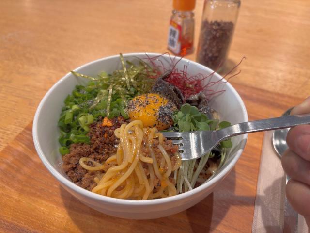 特性ごまダレの旨味と、花椒のシビ旨がクセになると人気の「坦々パスタ」をベースに、香ばしい炙り道産豚ひき肉や、小ねぎをトッピング。