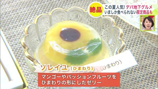 ソレイユ(ひまわり)は、マンゴーやパッションフルーツをひまわりの形にしたゼリー。まわりと中の食感が違うんですって。