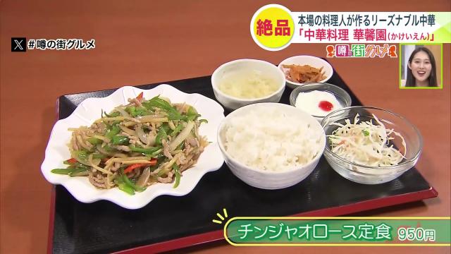 『チンジャオロース定食』は、ボリューム満点のチンジャオロースと、サラダ、スープ、デザートが付いて950円(税込)という価格。