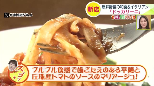 平麺がトマトソースとよく絡み、野菜の味をそのまま感じられる一皿です。