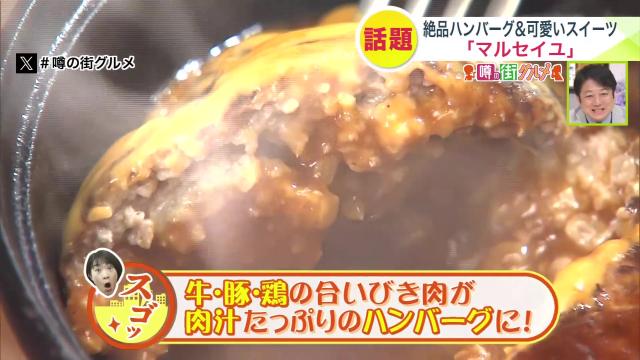 牛・豚・鶏の合いびき肉で焼き目を付けたあとに8分間蒸し焼きにすることで、肉汁たっぷりで肉々しいハンバーグになるんだとか。