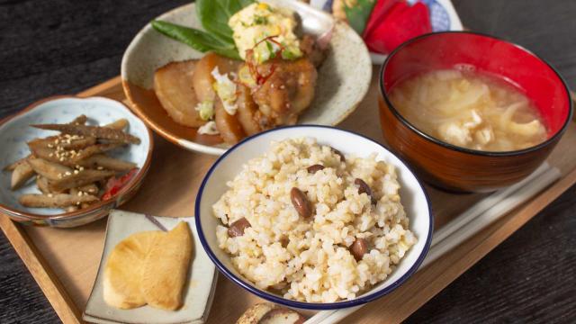 「ゆのん」時代の人気メニュー「一汁三菜」定食は、特別栽培玄米を使用したご飯、丘珠の自社農園で栽培される無農薬野菜をたっぷり使用しています。