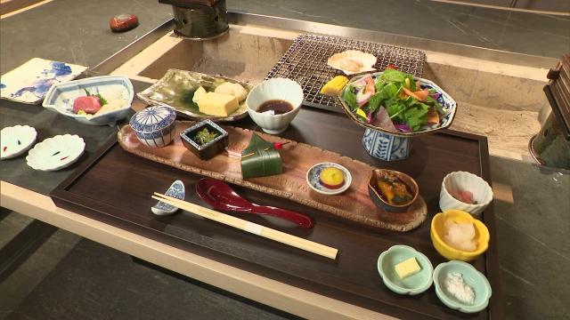 グランドオープンの1日、早速宿泊客がこの「囲炉裏朝食」を楽しんでいました。