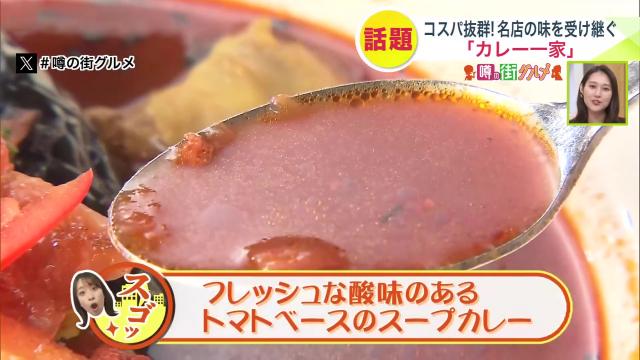 スープは、鶏肉、タマネギ、トマトなどをじっくり煮込み、20種類以上のスパイスと合わせているので、ピリ辛なうま味とトマトのさわやかな酸味が合わさりクセになると、子どもから年配まで幅広い世代に人気なのだそう。