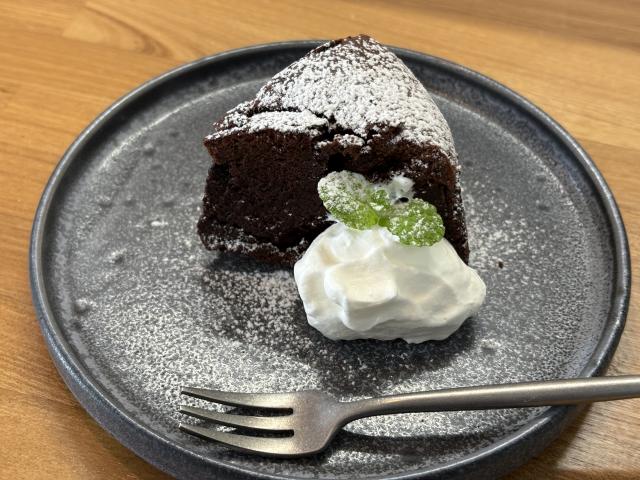 ずっしり重めの「濃厚ガトーショコラ 450円(税込)」は、チョコレートそのものを食べているかのような、贅沢で濃厚な味わいです。ちょっぴり苦めの「ジョジョブレンド 550円(税込)」がよく合います。
