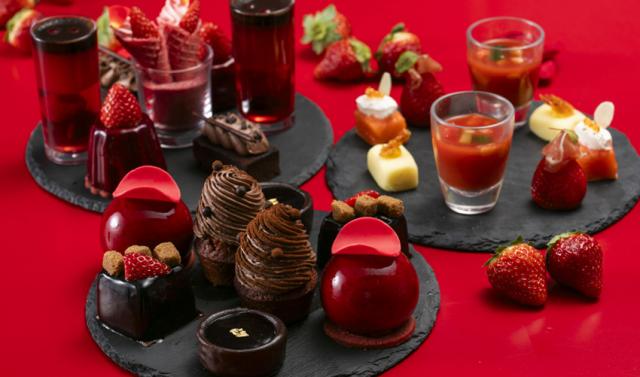 こちらは深みのあるルビーレッドを基調とした、艶やかで大人っぽい雰囲気が魅力。 「タルト ショコラ ミロワール」や「ヴェリーヌ ショコラ フランボワーズ」など、苺の甘酸っぱさにショコラのコクを掛け合わせたメニューが登場します。